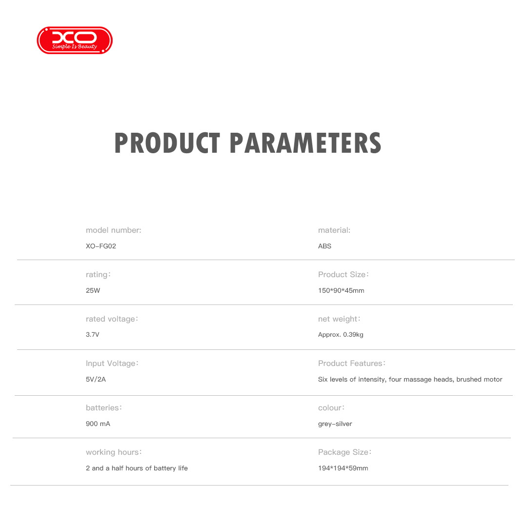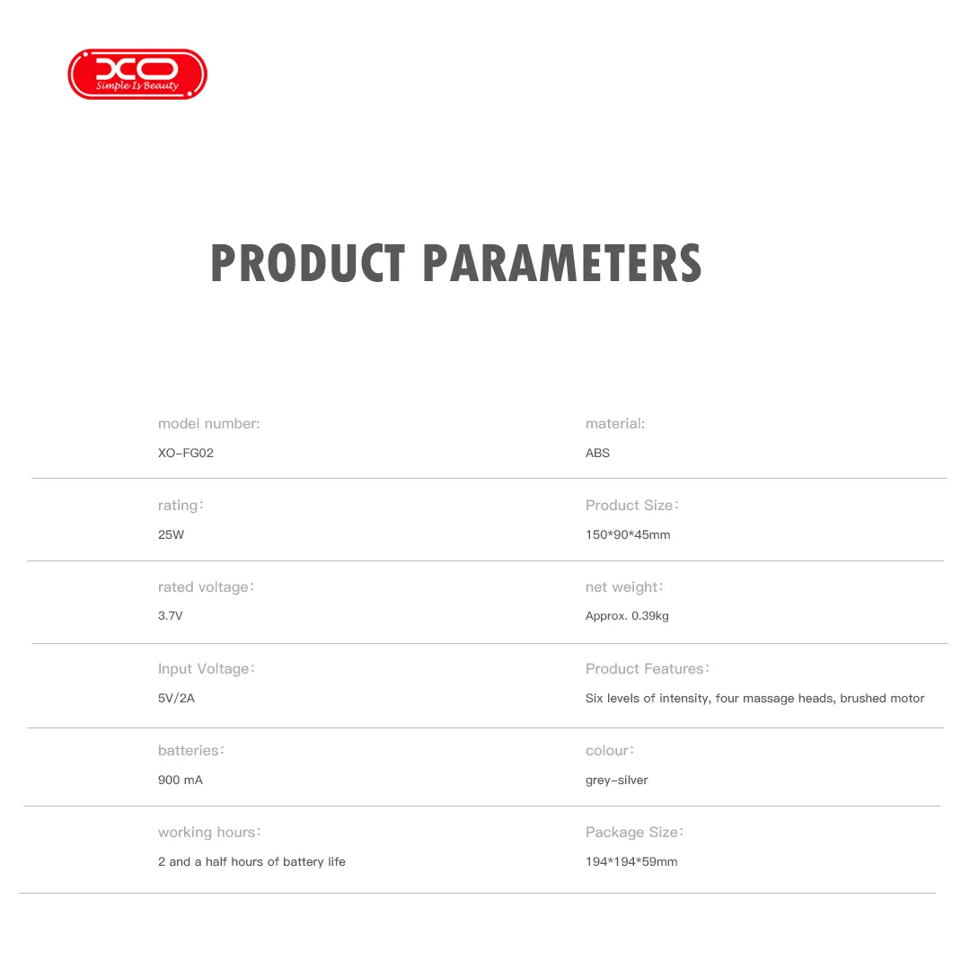Máy massage mini XO FG02 không chỉ hiệu quả mà còn cực kỳ tiện lợi. Với trọng lượng chỉ 365g và kích thước nhỏ gọn, bạn có thể dễ dàng cầm nắm và mang theo khi đi làm, đi du lịch. Thiết kế đơn giản, tinh tế với tông màu xám và bạc, phù hợp với mọi phong cách. Chất liệu ABS cao cấp, an toàn cho da và bền bỉ theo thời gian.