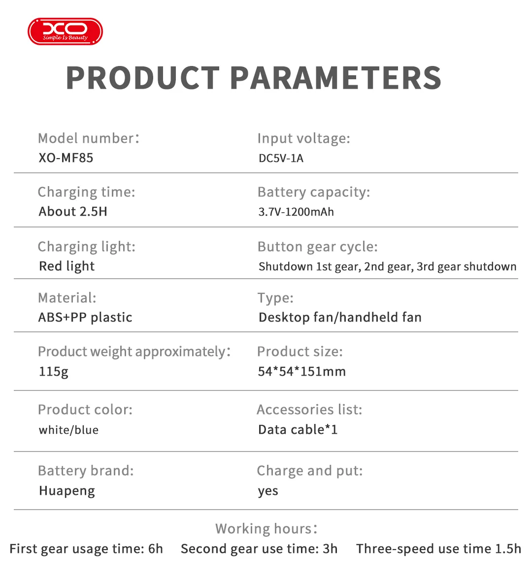 Điểm nổi bật của chiếc quạt này là thiết kế siêu nhỏ gọn và trọng lượng siêu nhẹ chỉ 115g, giúp bạn dễ dàng bỏ túi xách, ba lô hay thậm chí là túi quần. Bạn có thể sử dụng quạt như một chiếc quạt cầm tay tiện lợi mọi lúc, mọi nơi. Chỉ mất khoảng 2,5 giờ để sạc đầy pin, XO MF85 luôn sẵn sàng đồng hành cùng bạn.