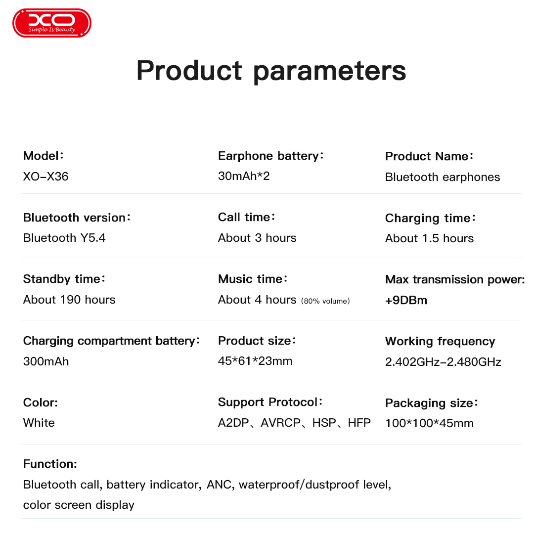 Hãy trải nghiệm sự đột phá với tai nghe airpod XO X36 ngay hôm nay! Với chất liệu ABS + PC bền bỉ, thiết kế nhỏ gọn chỉ 4g mỗi tai, và khả năng kết nối thông qua các giao thức Bluetooth tiên tiến (A2DP, AVRCP, HSP, HFP), đây chính là chiếc airpod chính hãng bạn không thể bỏ lỡ.