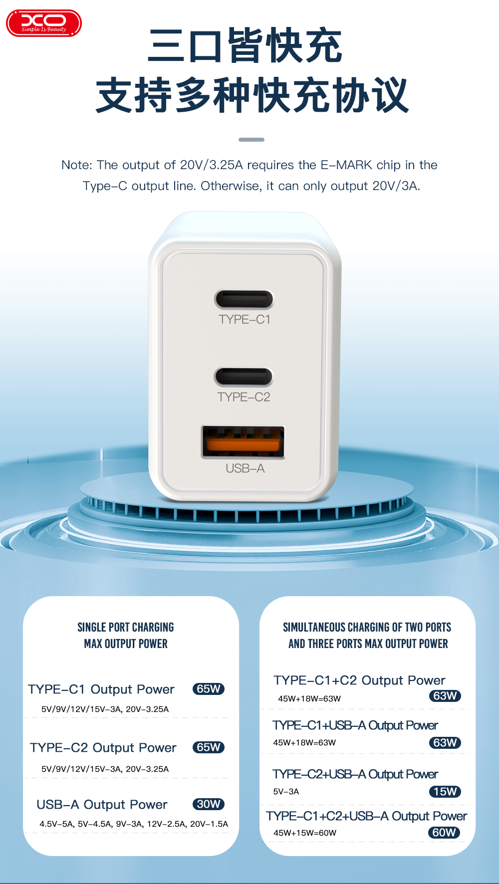 - TYPE-C1 + USB-A: 45W + 18W = 63W