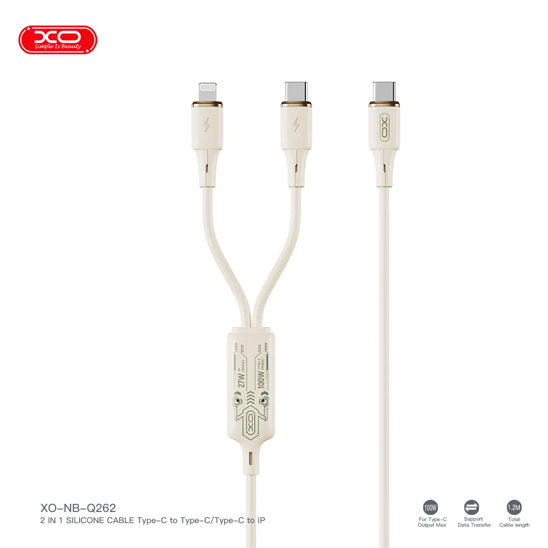 Với thiết kế 2 trong 1, dây sạc điện thoại XO Q262 có chiều dài chính 1,2m, bao gồm dây chính 0,9M và dây phụ 0,3M. Chất liệu TPE cao cấp cùng với đầu nối ABS mạ vàng đảm bảo độ bền và khả năng chống mài mòn. Dây hỗ trợ sạc nhanh 60W Type-C và 27W Lightning, giúp bạn tiết kiệm thời gian sạc đáng kể. Đặc biệt, bạn có thể sạc đồng thời hai thiết bị, với cáp sạc cho iPhone và cáp sạc cho Samsung.