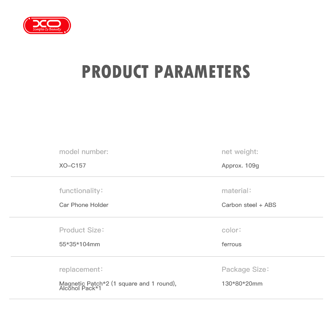 Giá đỡ điện thoại mini XO C157 với kích thước nhỏ gọn chỉ 54.936.716.5mm, có thể gấp lại gọn gàng, không chiếm diện tích và không làm cản trở tầm nhìn. Chất liệu thép carbon cao cấp và nam châm N40 siêu mạnh đảm bảo độ bền bỉ và lực giữ chắc chắn. Sản phẩm còn đi kèm 2 miếng dán nam châm (hình vuông và tròn) cùng gói cồn để bạn có thể gắn vào nhiều thiết bị khác nhau một cách dễ dàng.