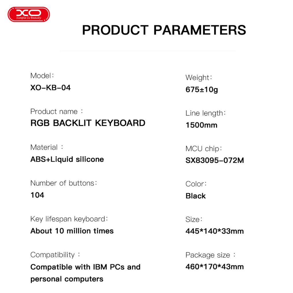 - Loại bàn phím: Đây là một bàn phím phát sáng có dây, sử dụng chất liệu ABS và silicone lỏng để tạo nên cảm giác bấm chân thực và thoải mái. Với công nghệ bàn phím cơ giả, XO KB04 tái hiện trải nghiệm bấm phím như bàn phím cơ thực thụ, nhưng lại nhẹ nhàng hơn và ít gây tiếng ồn.
